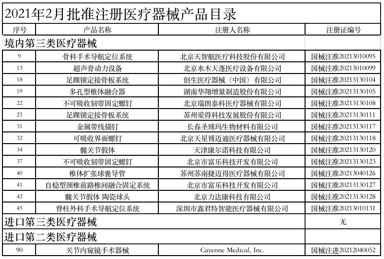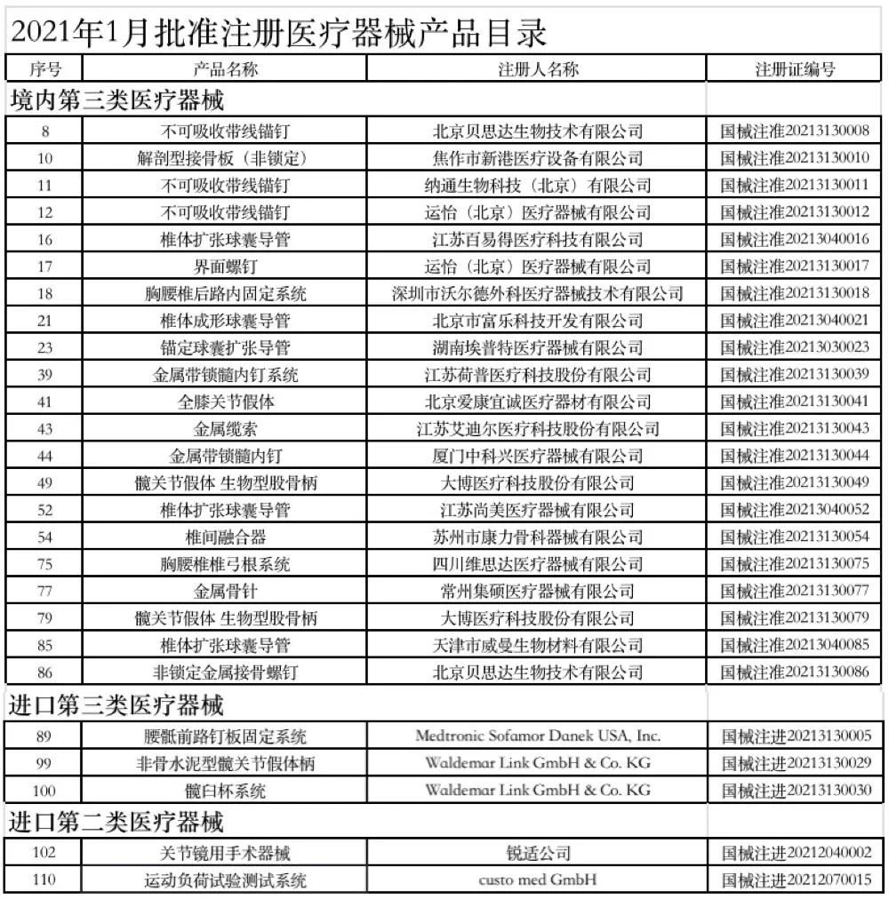 附:2021年1-6月获批的骨科医疗器械产品