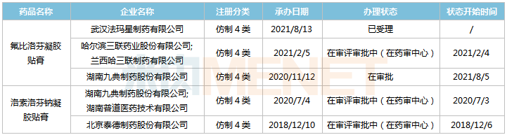 九典制药、三联药业、武汉法玛星以仿制4类提交氟比洛芬凝胶贴膏上市申请,其中九典制药的产品已率先进入行政审批阶段,冲刺国产第2家。