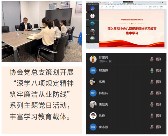 在协会党总支示范带头下,协会党总支所属各支部推动支委带头学、党员日常学,通过读书班、线上“云课堂”等方式,以“集中学习+专题研讨+个人研学”的组合模式,重点学习习近平总书记关于作风建设的重要论述、中央八项规定及其实施细则精神,增强党员干部落实中央八项规定精神的自觉性、主动性。