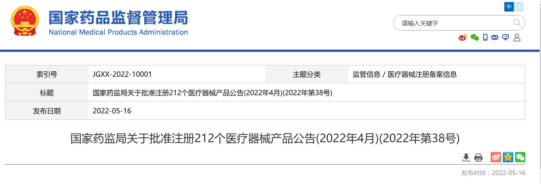 5月16日,国家药监局发布《关于批准注册212个医疗器械产品公告(2022年4月)(2022年第38号)》。